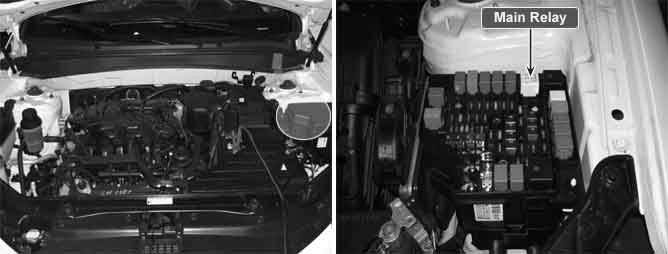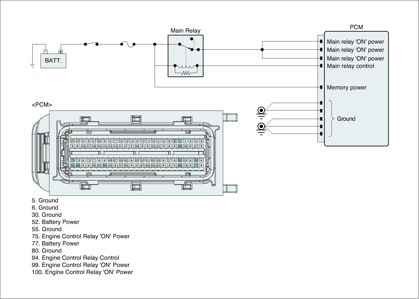 The ECM provides ground to one side of the coil of the main relay and the other side is connected to the battery. The ECM monitors battery voltage and the voltage after the main relay.