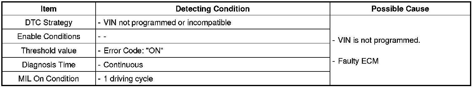 The purpose of this logic is to prevent a vehicle from leaving the assembly plant or service station without a VIN in its EEPROM memory. If the VIN writing is not programmed or incompatible, the ECM determines that a fault exists and a DTC is stored.