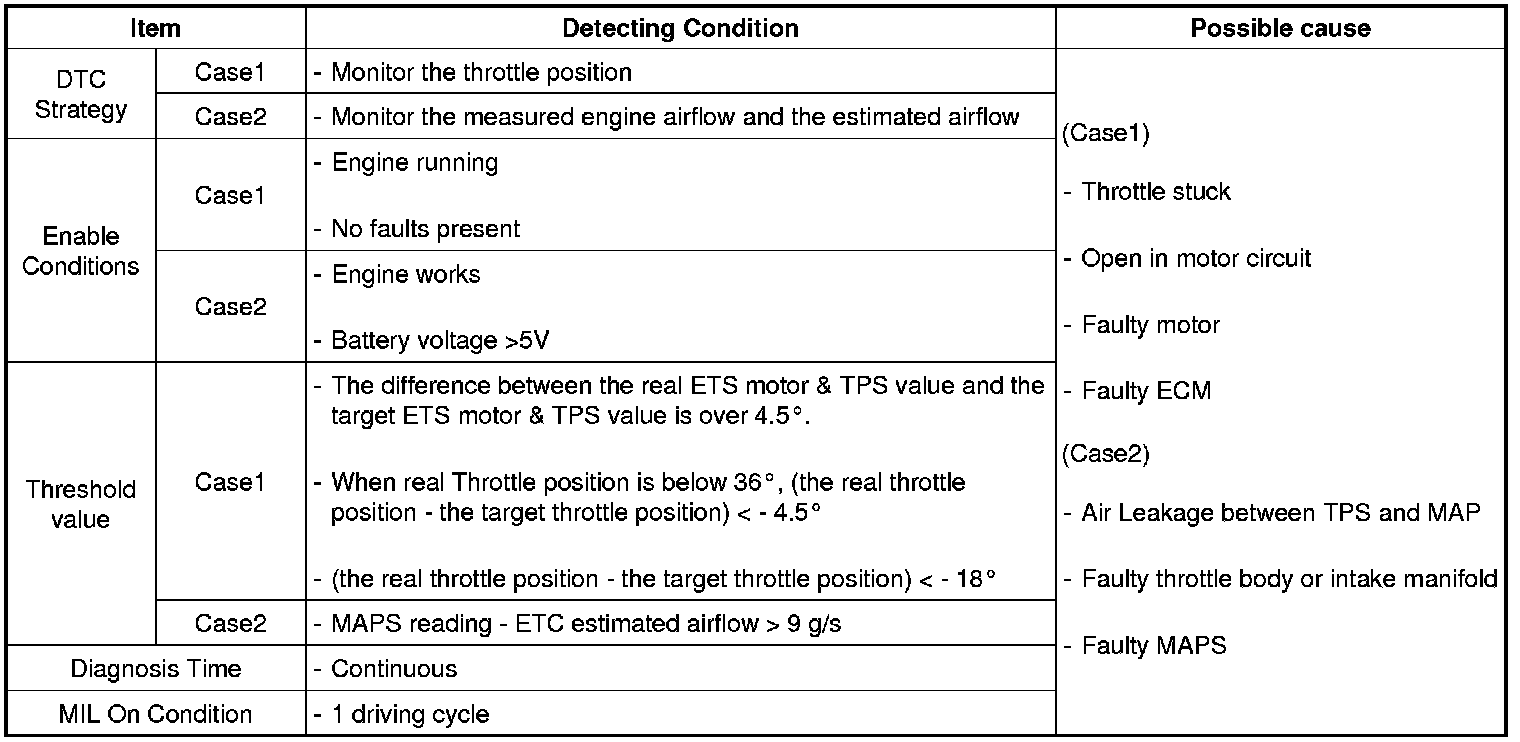Comparing real intake air flow and the intake air flow calculated by ETS under detecting condition, if the air flow more than threshold value is detected for more than 19 sec, ECM sets P0638.