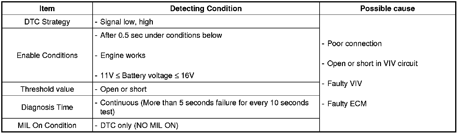Checking the output voltage from VIV (Variable Intake Manifold Valve) every 10 sec. under detecting condition, if the value within detecting condition lasts for more than 5 sec, ECM sets P0660.