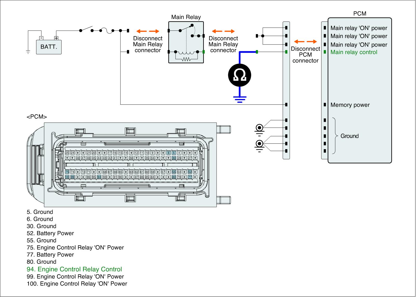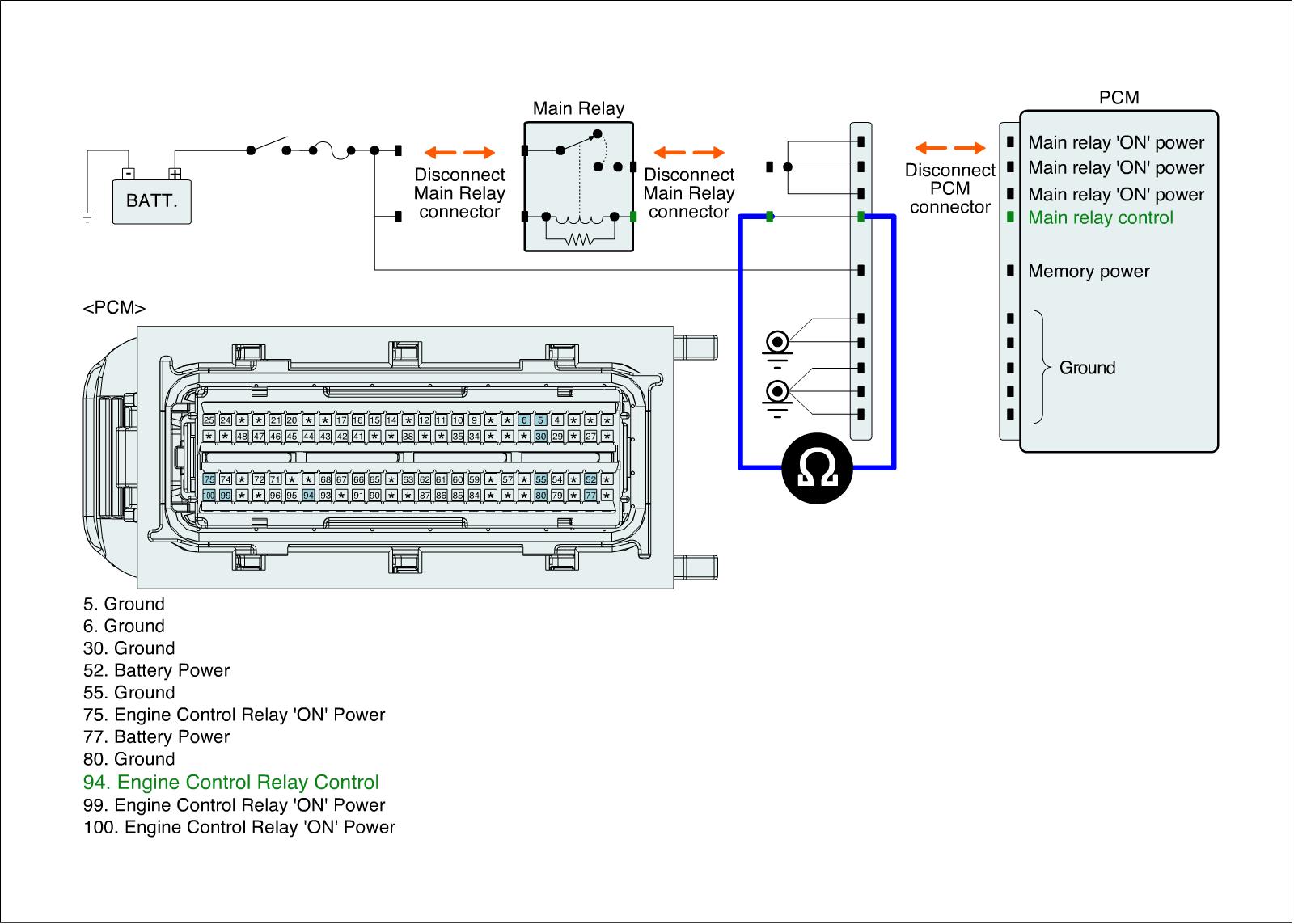 1. IG "OFF" and disconnect the main relay and ECM connector.