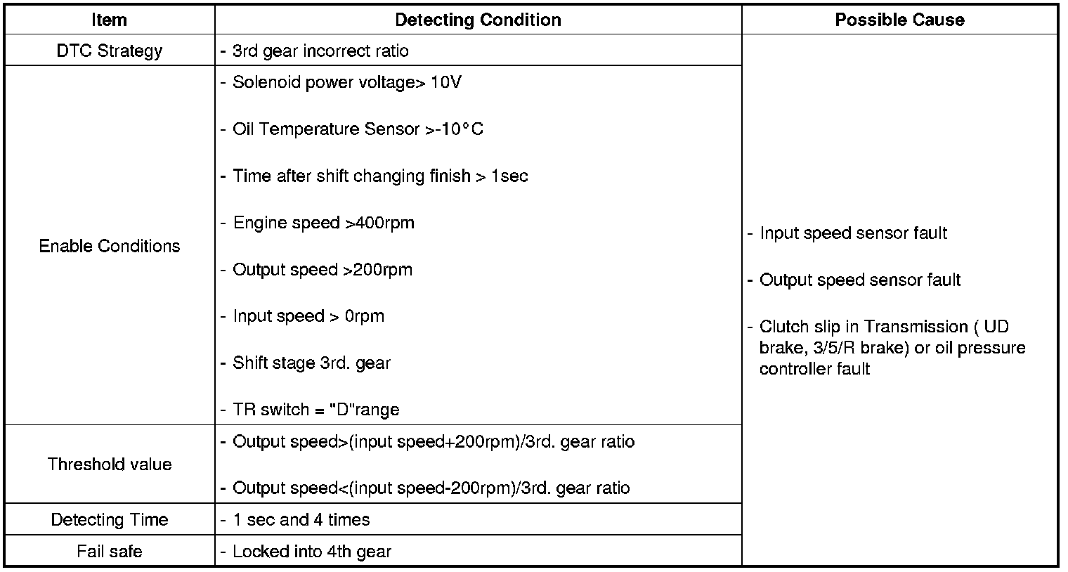 This code is set when Input speed sensor value is different with TCM operation value, caused by control valve sticking, solenoid valve fault (most of fault is mechanical, rarely electrical fault).