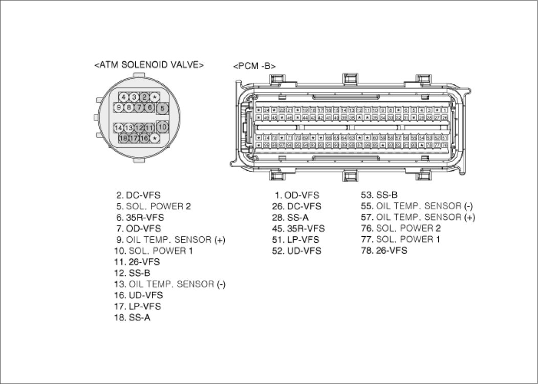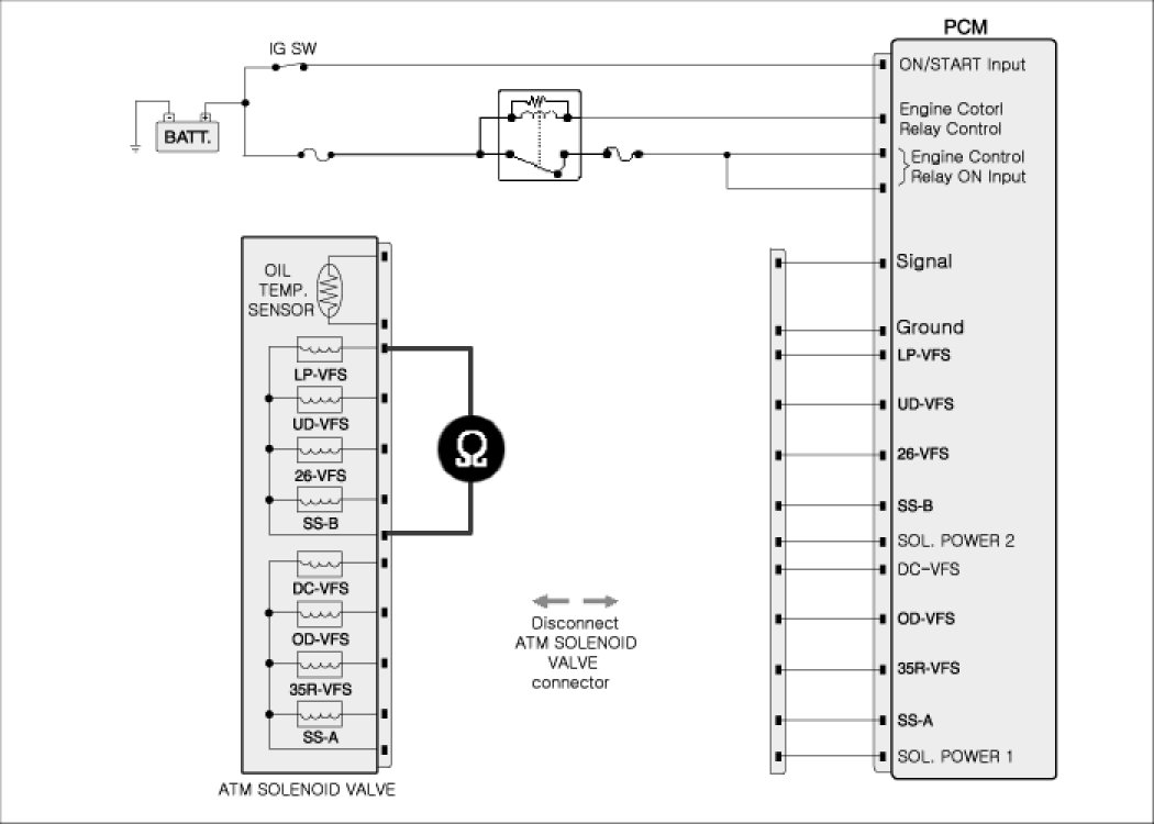 3. Measure a resistance between "Pressure control solenoid valve (LP-VFS) " terminal and power at ATM solenoid valve connector.