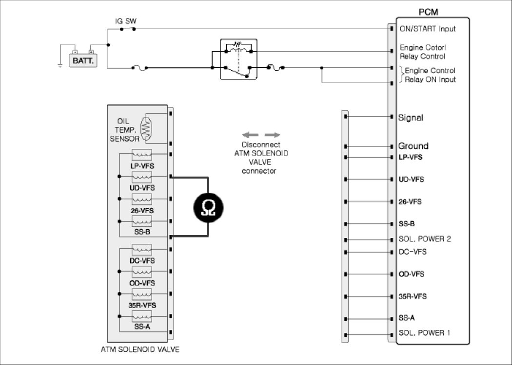 3. Measure a resistance between "Shift control solenoid valve (UD-VFS) " terminal and power at ATM solenoid valve connector.