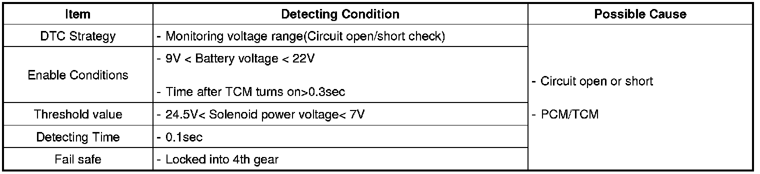 PCM (TCM) monitored supplied voltage to ATM solenoid valve. This voltage is without specific, then gear is fixed 4th speed.