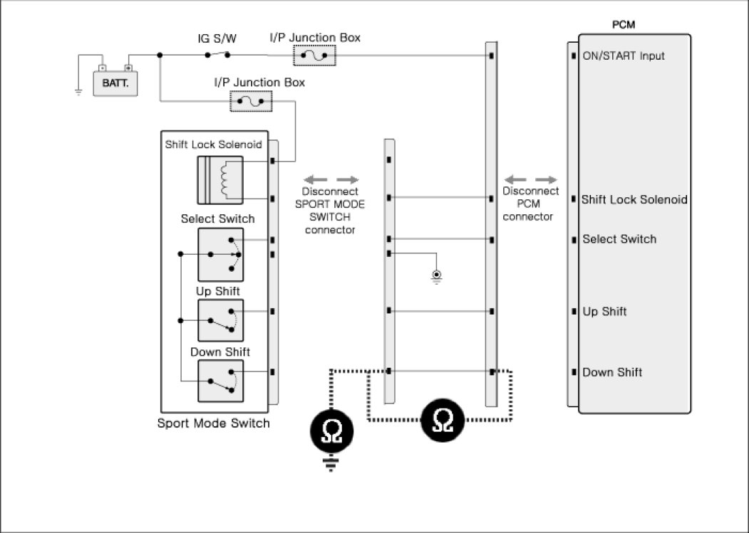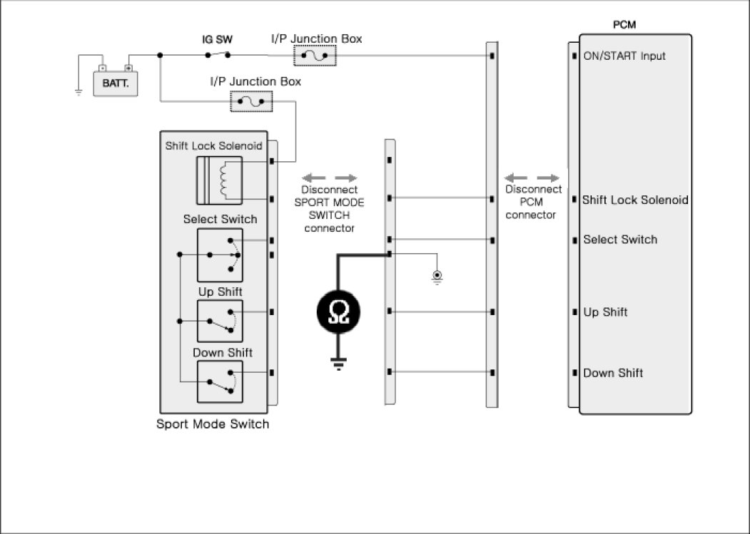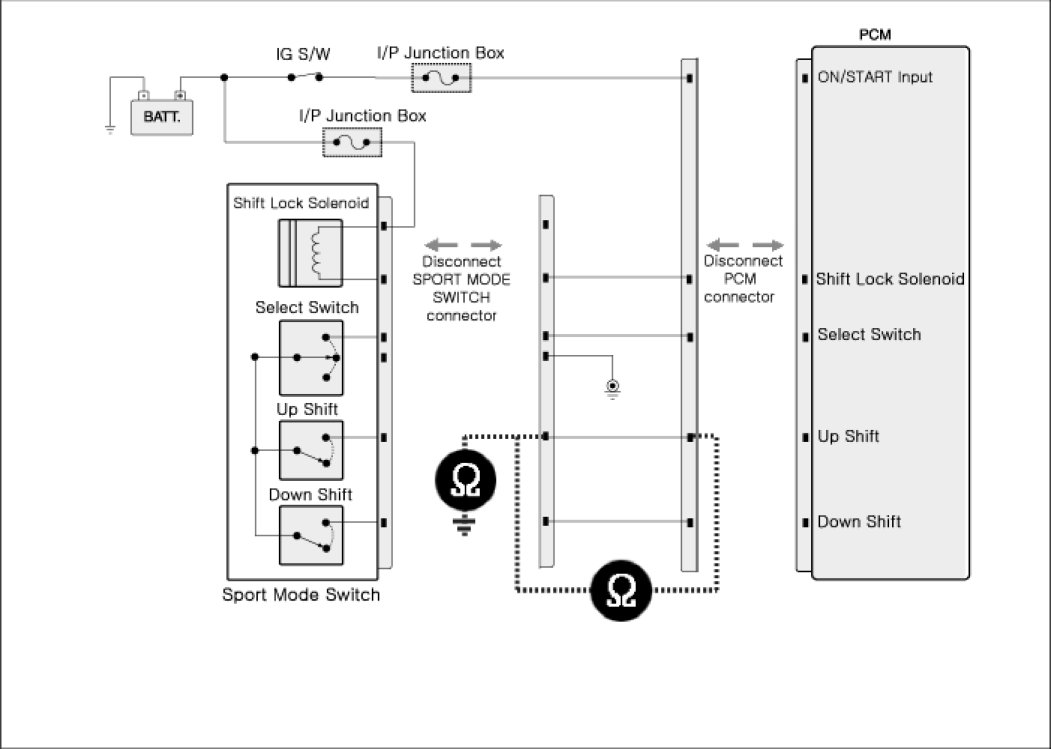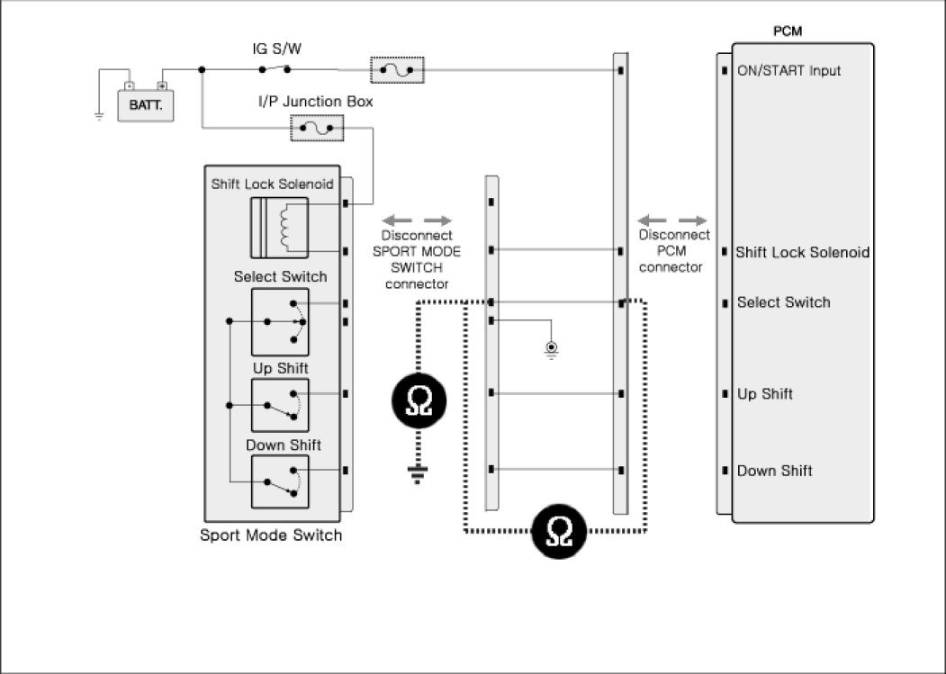 3. Measure resistance between "Down shift" connector's control terminal of Sports mode switch harness and "Down shift" connector's control terminal of PCM TCM harness.