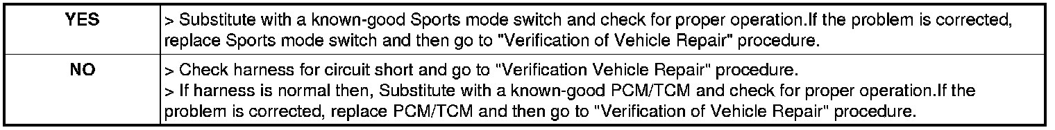3. Measure resistance between "Up shift" connector's control terminal of Sports mode switch harness and "Up shift" connector's control terminal of PCM TCM harness.