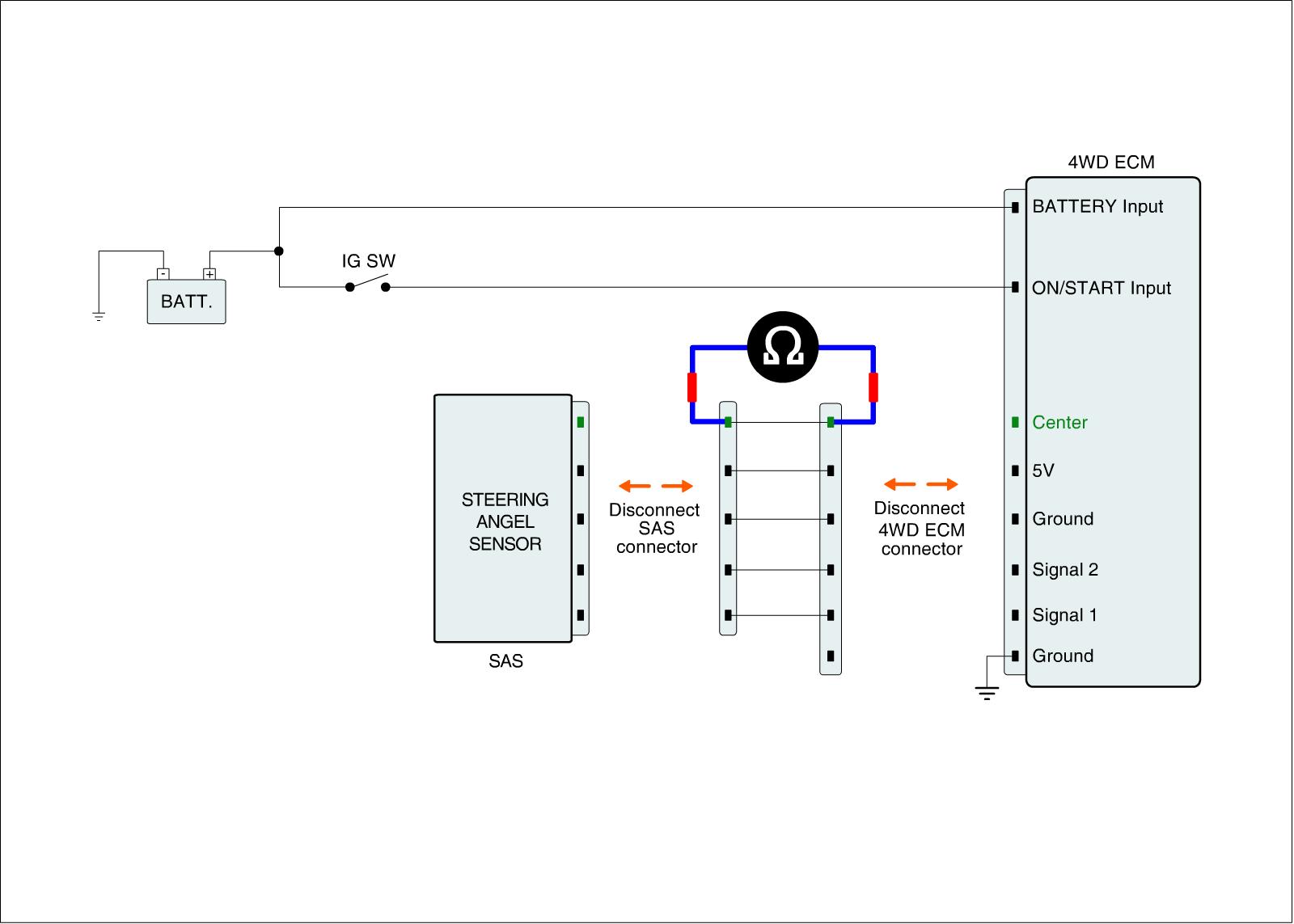 3. Measure resistance between center of Steering angle sensor harness connector and 4WD ECM harness connector.