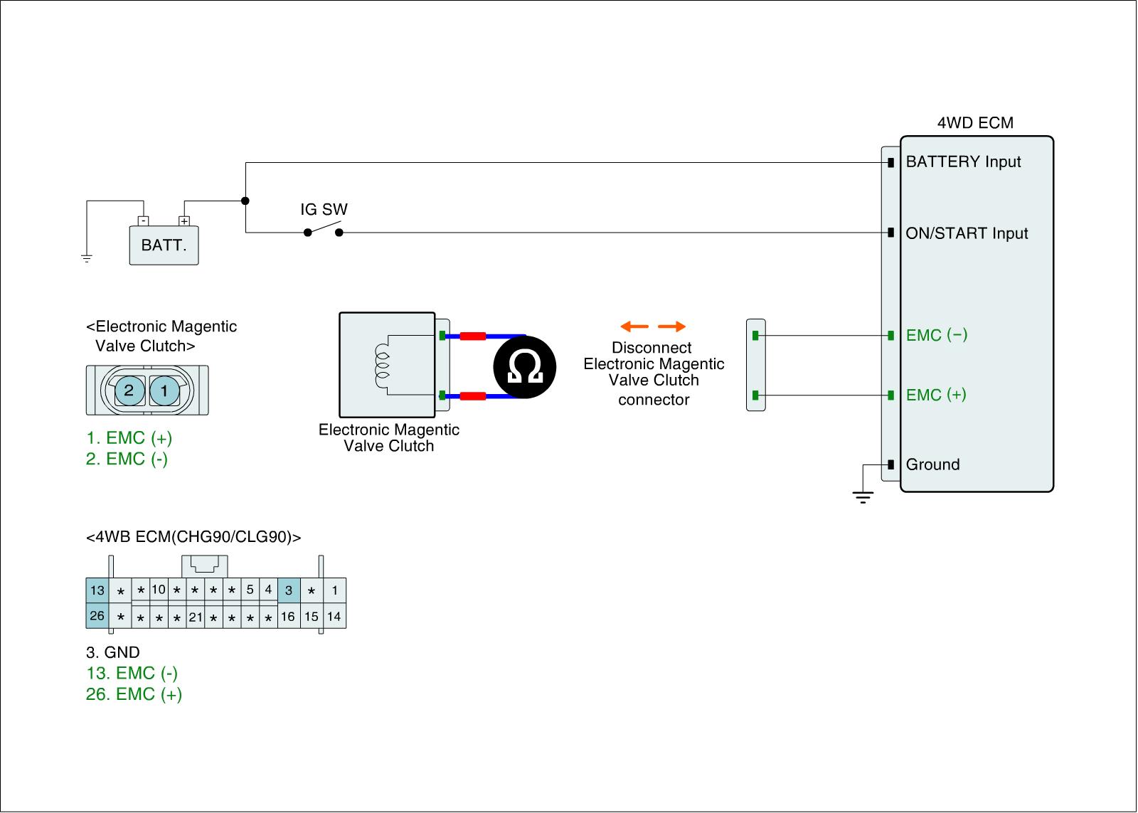 3. Measure the resistance (Component side) between EMC (+) and EMC (-) of the "Electric Magnet Valve Clutch" connector.