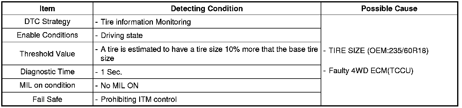 ITM (InterActive Torque Management) system can detect the tire size fault by calculating each wheel speed, if the tire size equipped at the vehicle is 10% bigger than normal tire.