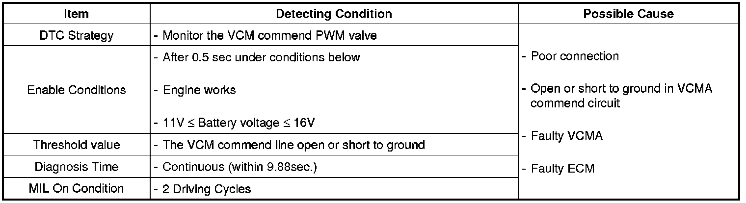 If VCM commend signal circuit is open or short to ground, ECM determines that a fault exists and a DTC is stored.