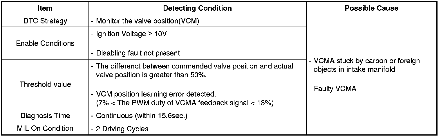 If the VCM position sensor presents less than 50% when the commended position is open, or greater than 50% when the commended position is close, or If initial position learning value of VCMA is out of specified range by carbon or foreign object in intake manifold, ECM determines that a fault exists and a DTC is stored.