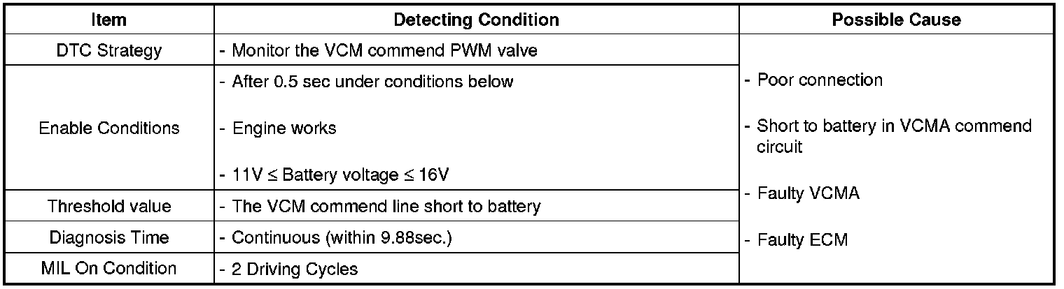 If VCMA commend signal circuit is short to battery, ECM determines that a fault exists and a DTC is stored.