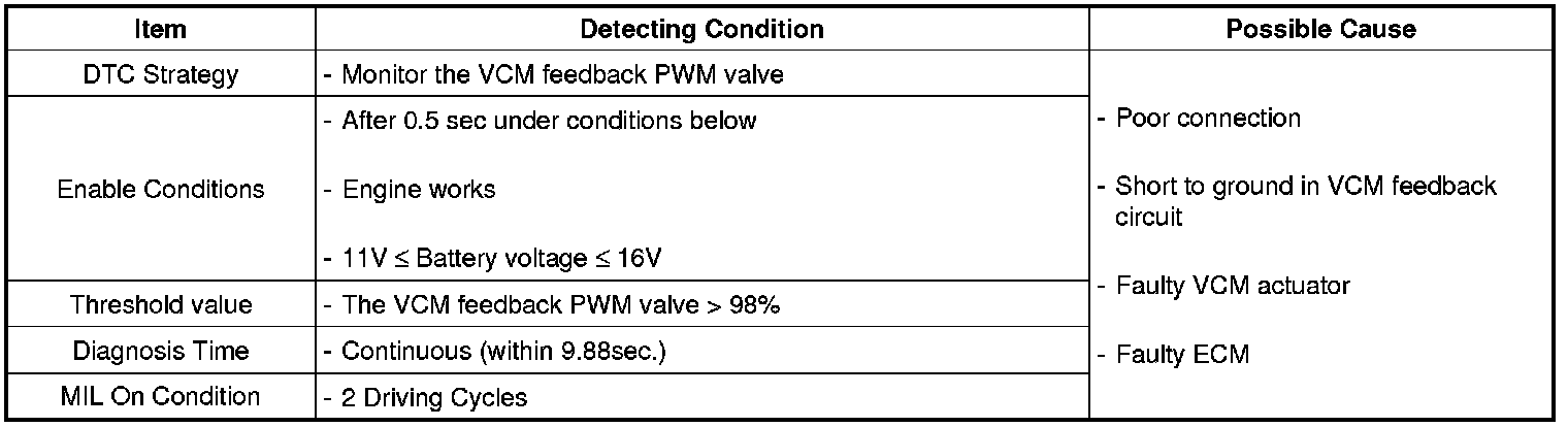 If VCM feedback signal circuit is short to ground, ECM determines that a fault exists and a DTC is stored.