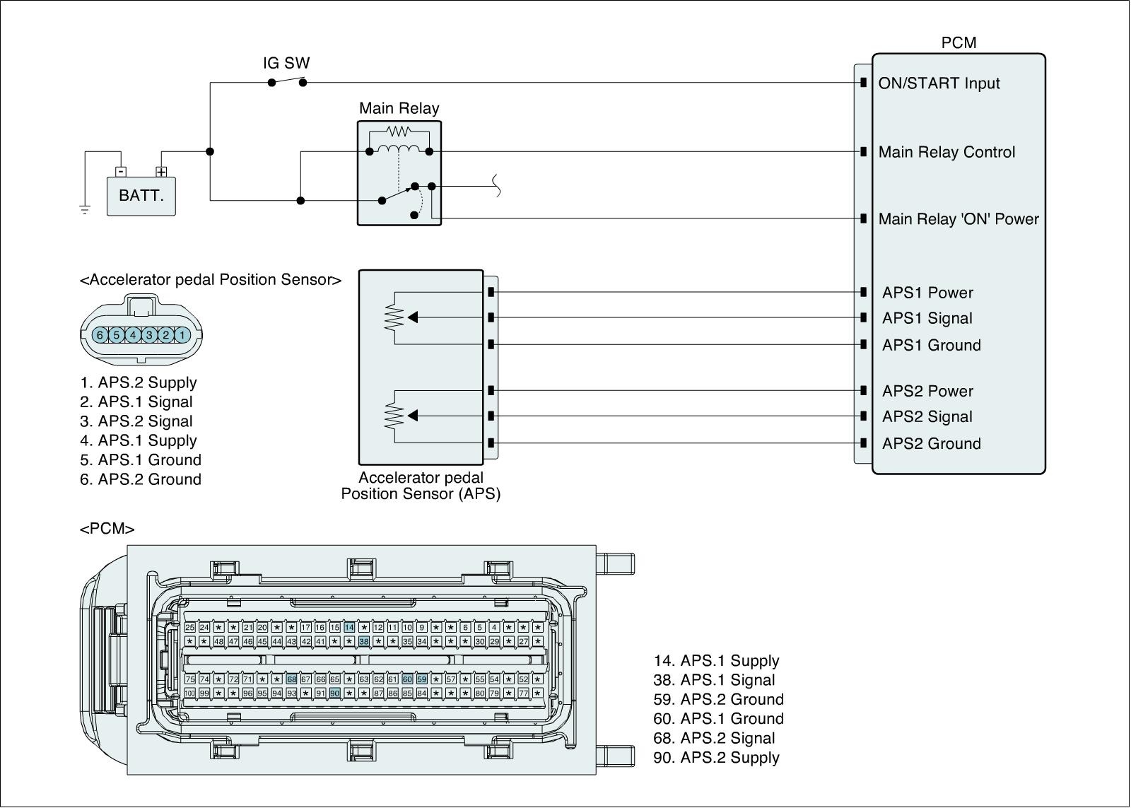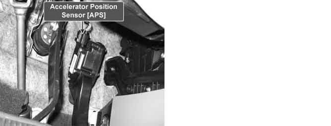 The Electronic Throttle Control (ETC) system is made of the components throttle body, Throttle Position Sensor (TPS) 1 & 2 and Accelerator Position Sensor (APS) 1 & 2. The APS is mounted in the accelerator pedal to detect the opening angle of the accelerator pedal. It has 2 sensors to detect the accelerator position and a malfunction of the accelerator position sensor. The ECM judges the current opening angle of the accelerator pedal from APS 1 & 2, and the ECM controls the throttle motor based on these signals.