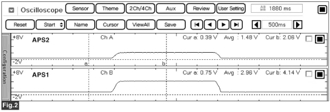 Signal waveform of APS 1 & 2 shows that APS 2 increases voltage just half of APS 1 voltage increase when accelerating.