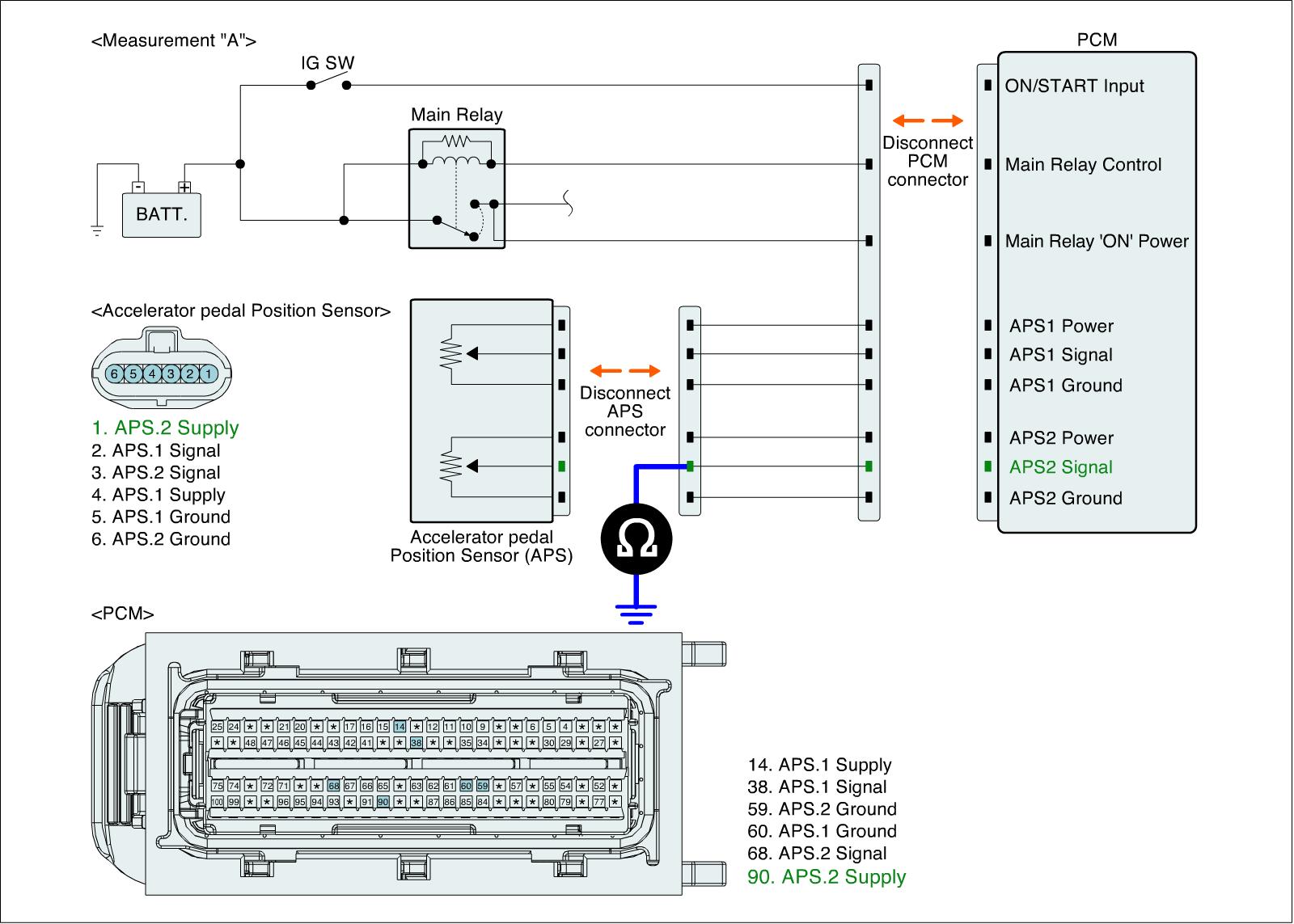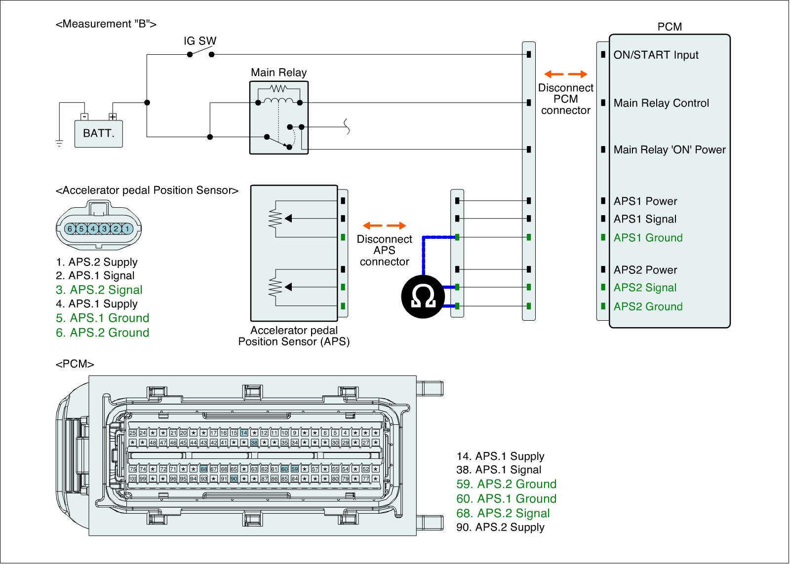 4. Measure resistance between APS 2 signal and APS 1 (2) ground terminals of APS harness connector. (Measurement "B")