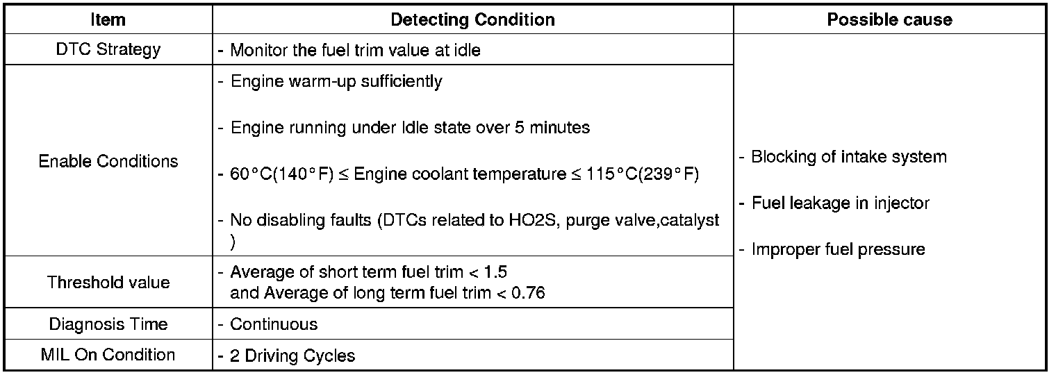 Checking the fuel trim value at idle under detecting condition, if its average exceeds the limit over certain period, ECM sets P2190.