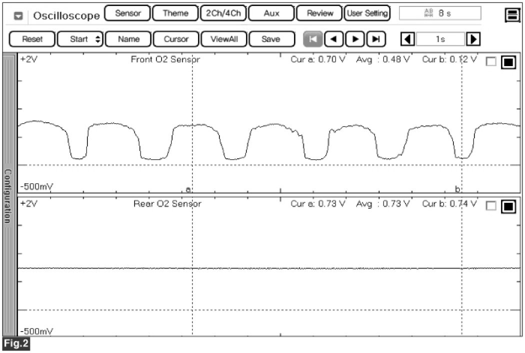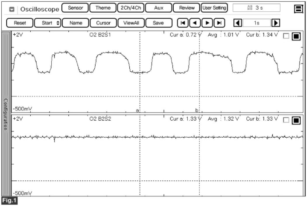 Fig.2) Normal waveforms of front HO2S (the upper) and rear HO2S (the lower) (sensor ground used)