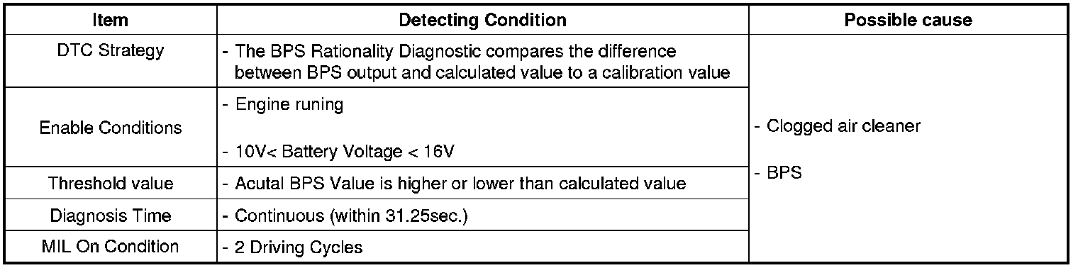The difference between values coming from the BPS Sensor and those are calculated is analyzed. ECM compares the difference between BPS output and calculated value while enable condition is met.