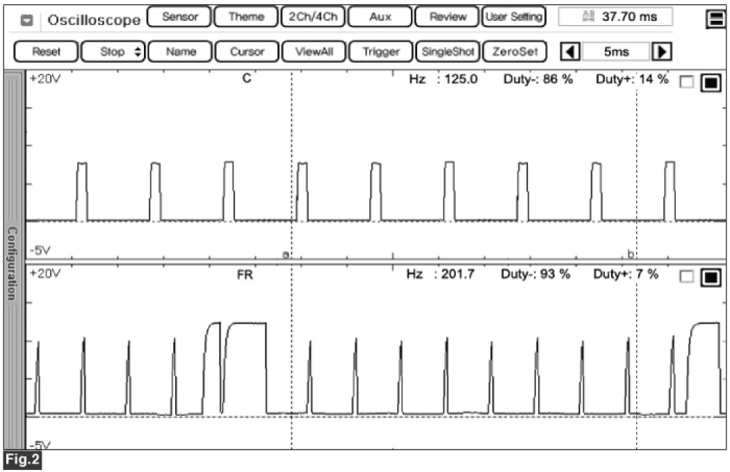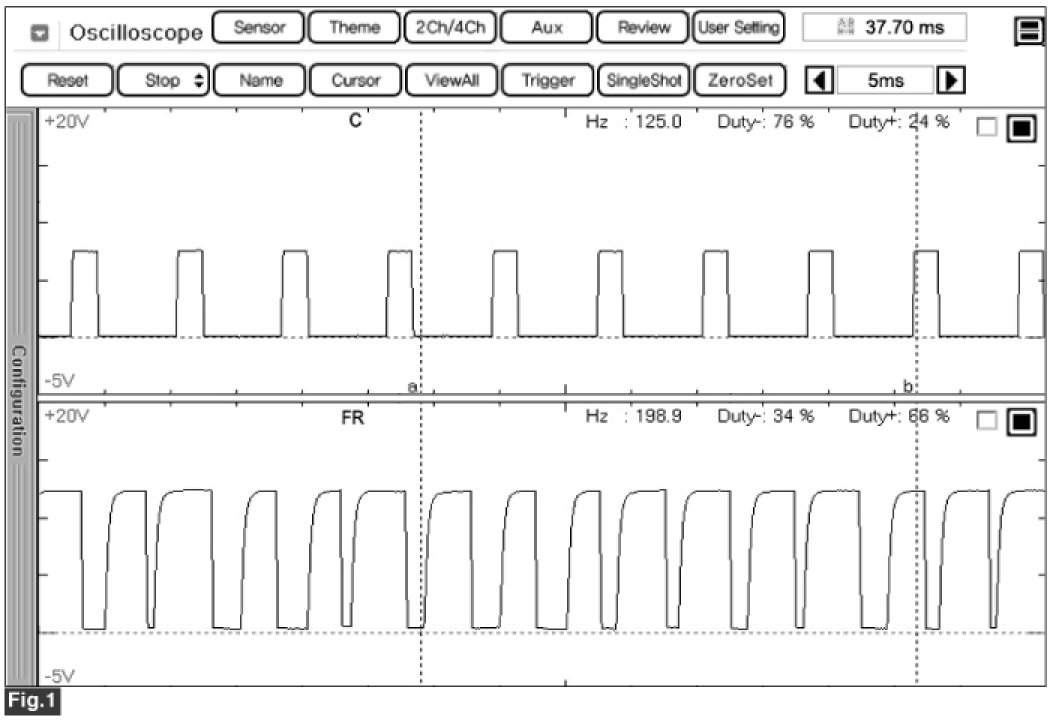 Fig.1) Normal waveforms of COM, FR terminal of alternator at idle.