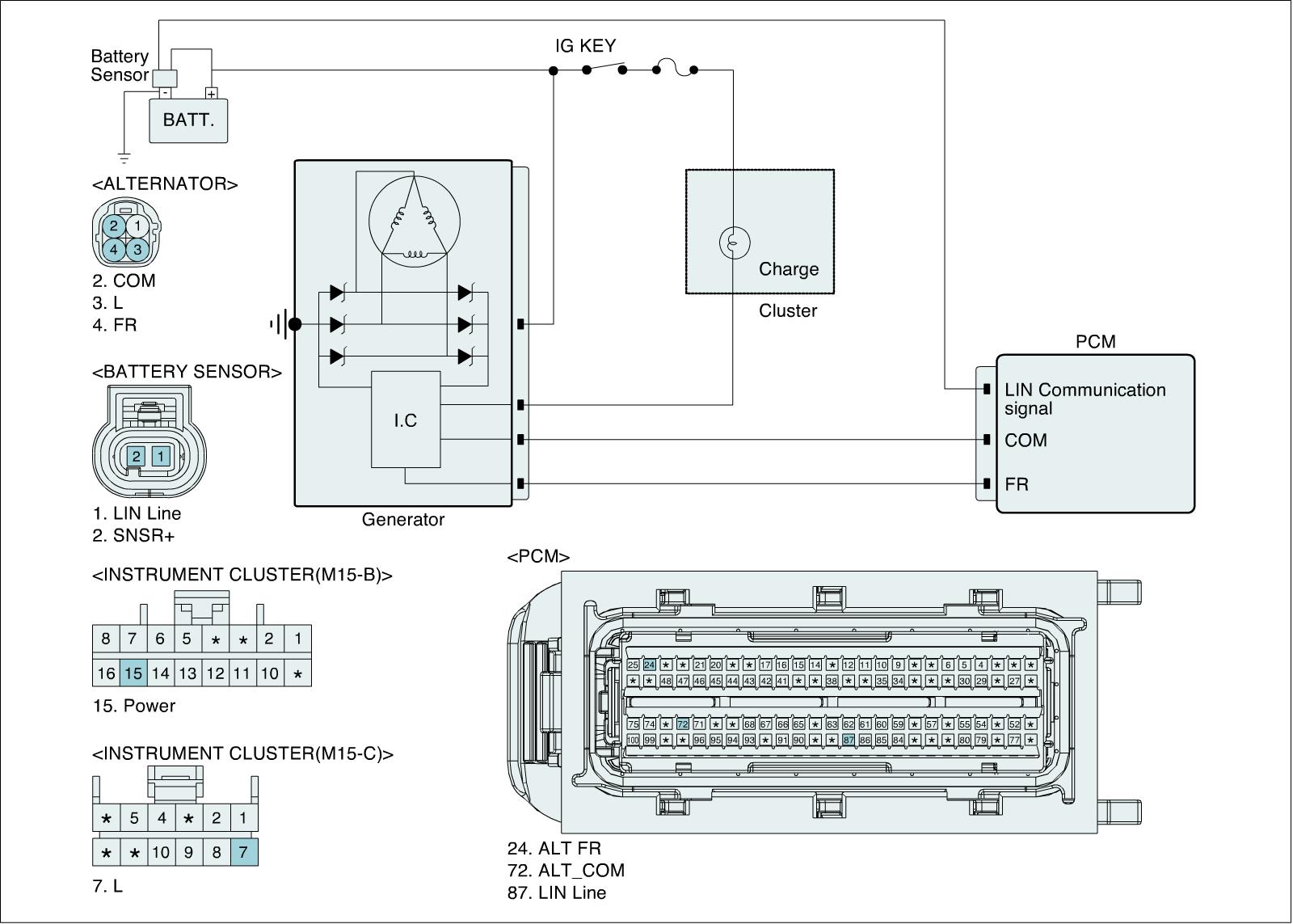 Many control units have applied to vehicle as it becomes more electronical. These units control their own system based on information from diverse sensors. Therefore necessity of common use of diverse sensor information and importance of stable power supply are gathering strength. Battery sensor is mounted on battery (-) terminal. It transmits battery voltage, current, temperature information to ECM. ECM controls generating voltage by duty cycle based on these signals.