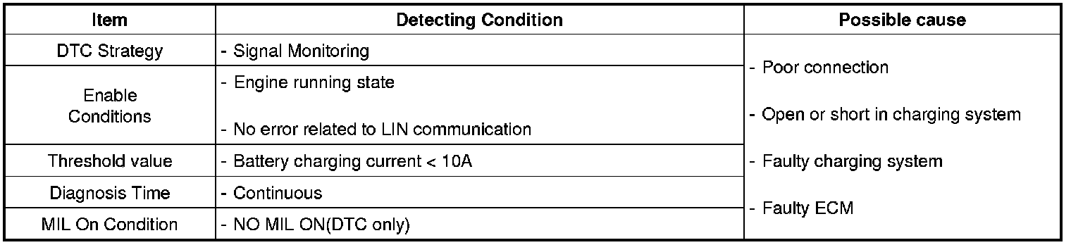 ECM sets this code when the battery charging current from battery sensor is too low.