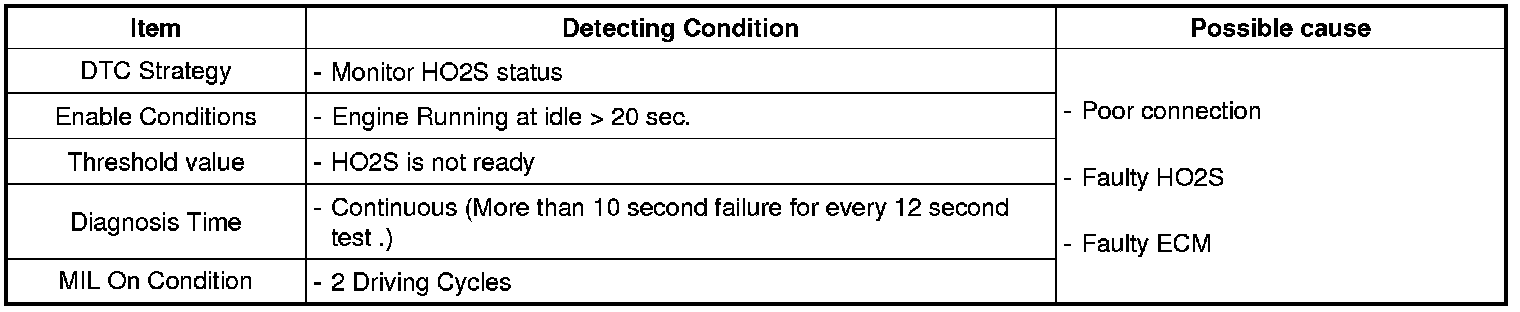 After warming-up, if accelerator pedal is released suddenly around 4000 rpm, the HO2S signal reading will be lower than 200 mV resulting from Fuel cut-off for the moment. Conversely, if suddenly accelerator pedal is depressed, HO2S signal reading will be around 0.6 V ~1.0 V. At idle, Normally HO2S signal will switch from lean to rich with 3 Hz. And as racing, Its frequency rises.