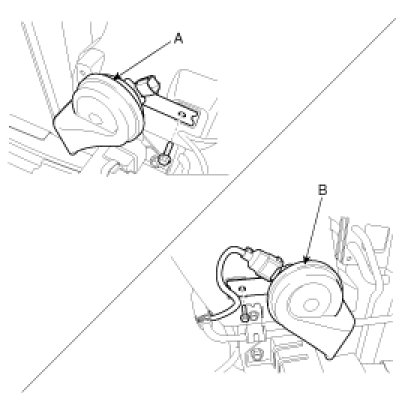 2. Remove the bolt and disconnect the horn connector, then remove the high pitch horn (A) and low pitch horn (B).