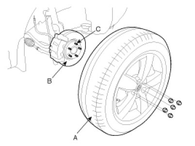 Be careful not to damage to the hub bolts (C) when removing the front wheel and tire (A).
