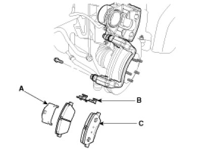 2. Replace shims (A), pad retainers (B), and brake pads (C).