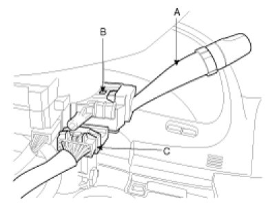 4. Remove the wiper switch (A) by pushing the lock pin (B) after disconnecting the connector (C).