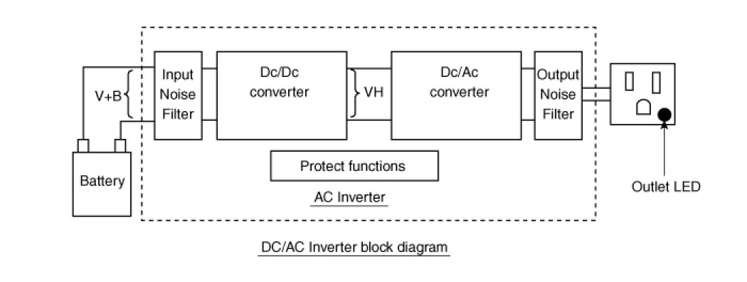 - DC/AC Inverter converts the battery's DC voltage to 115Vrms, 60Hz AC voltage.