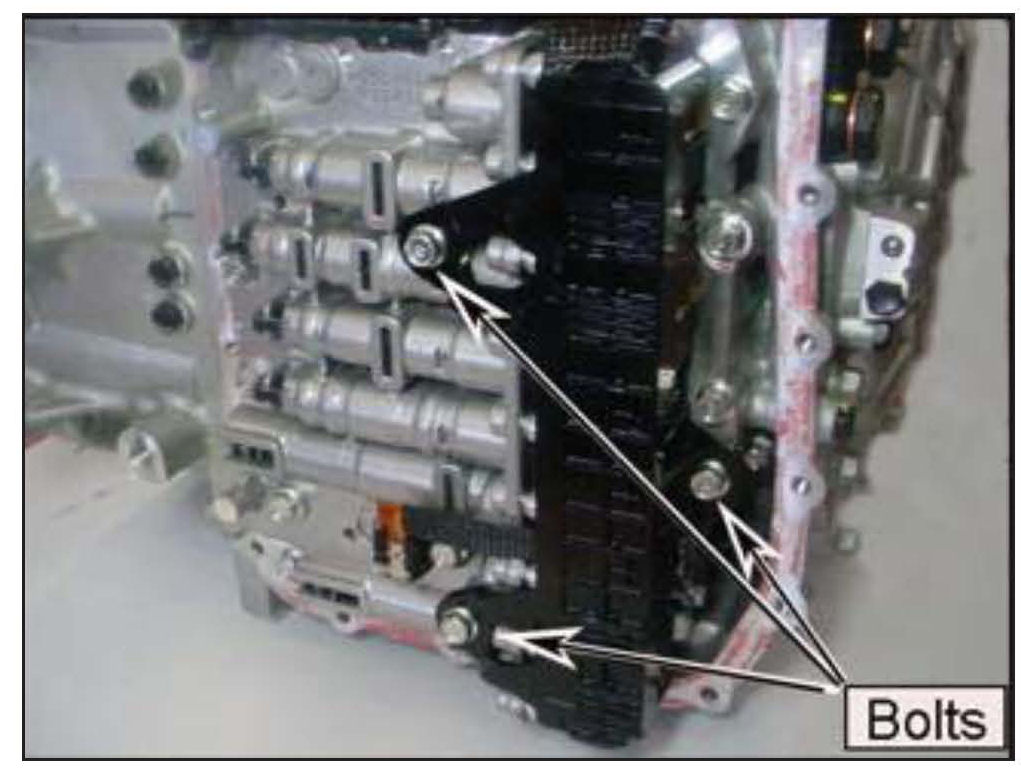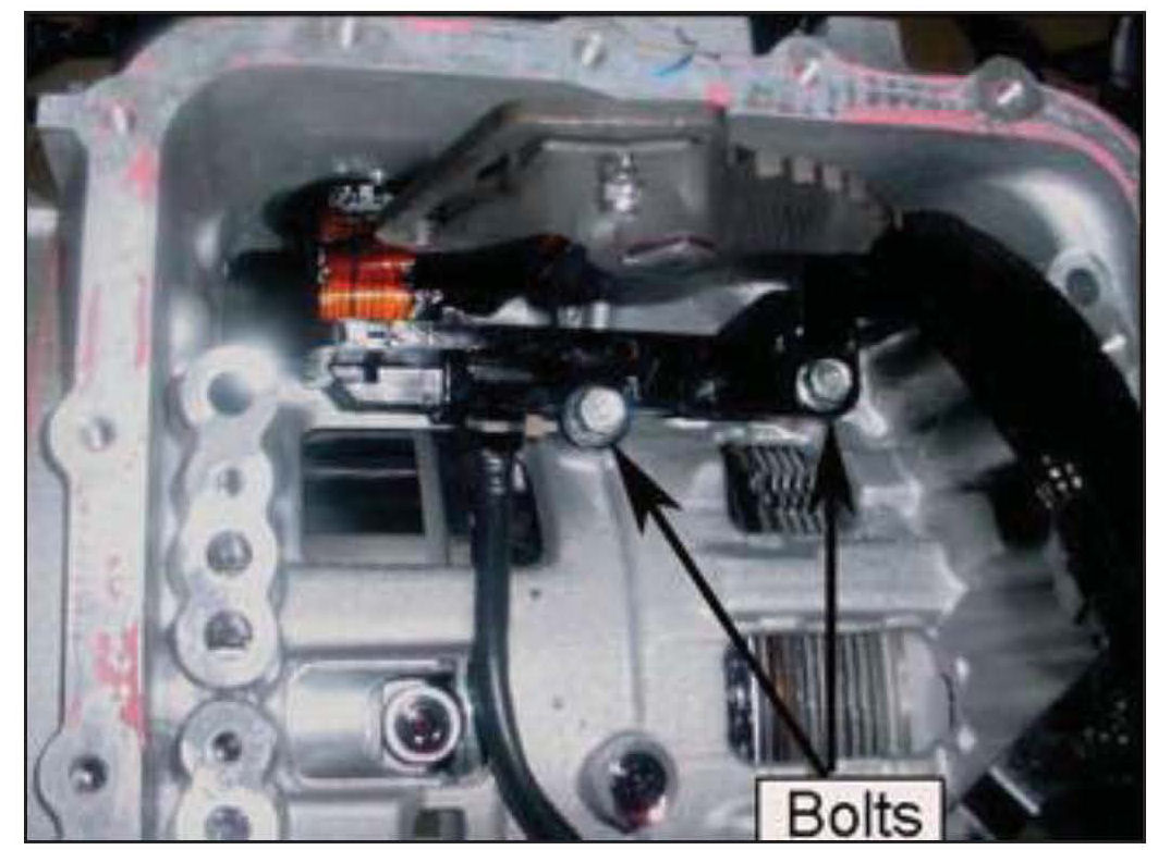 17. Remove two bolts that secure the valve body harness to the case.