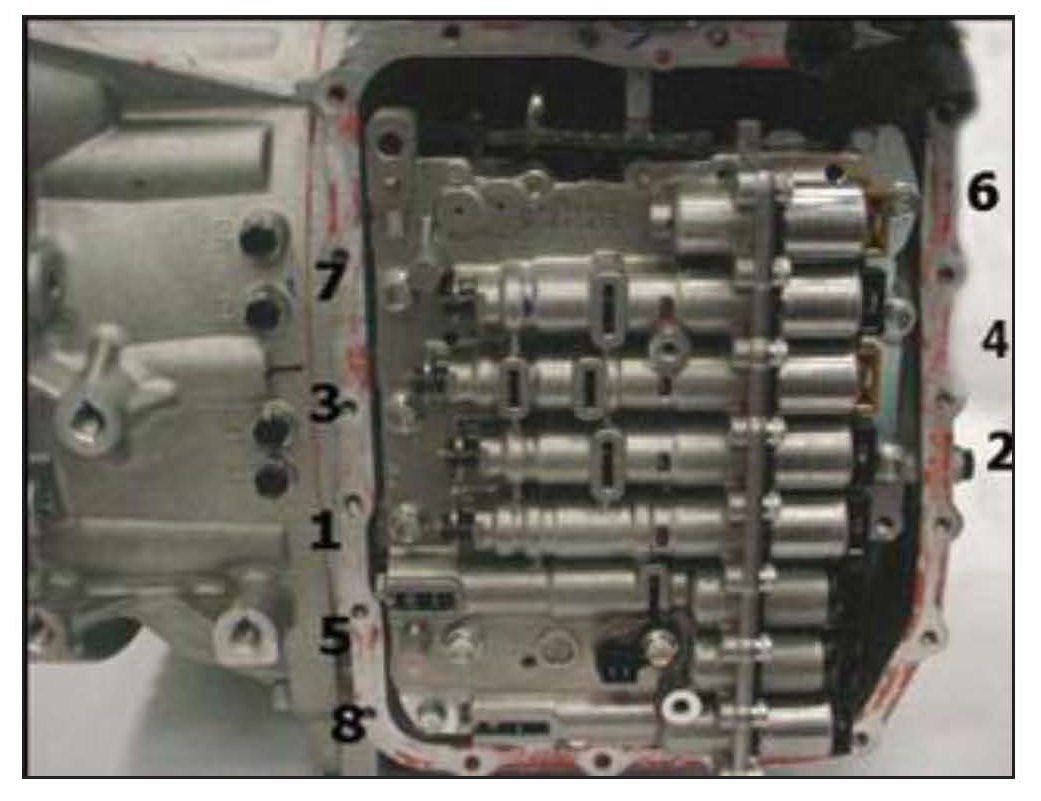 15. Remove 8 bolts in the order shown and remove the valve body.
