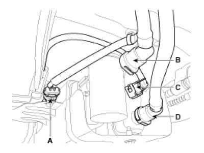2. Disconnect the ventilation tube quick-connector (B) and the vapor tube quick-connectors (C, D).
