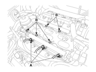 5. Remove the delivery pipe installation bolts (B).
