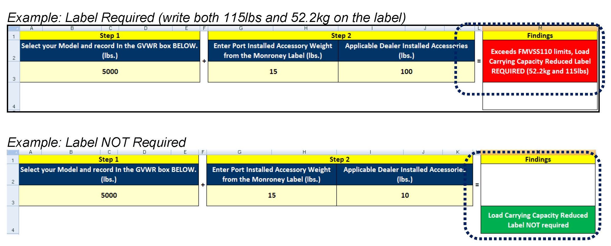 2. The downloaded sheet has an automated calculation that will determine if the vehicle requires the "Load Carrying Capacity Reduced" Label. It will also indicate the weight to be recorded on the label.