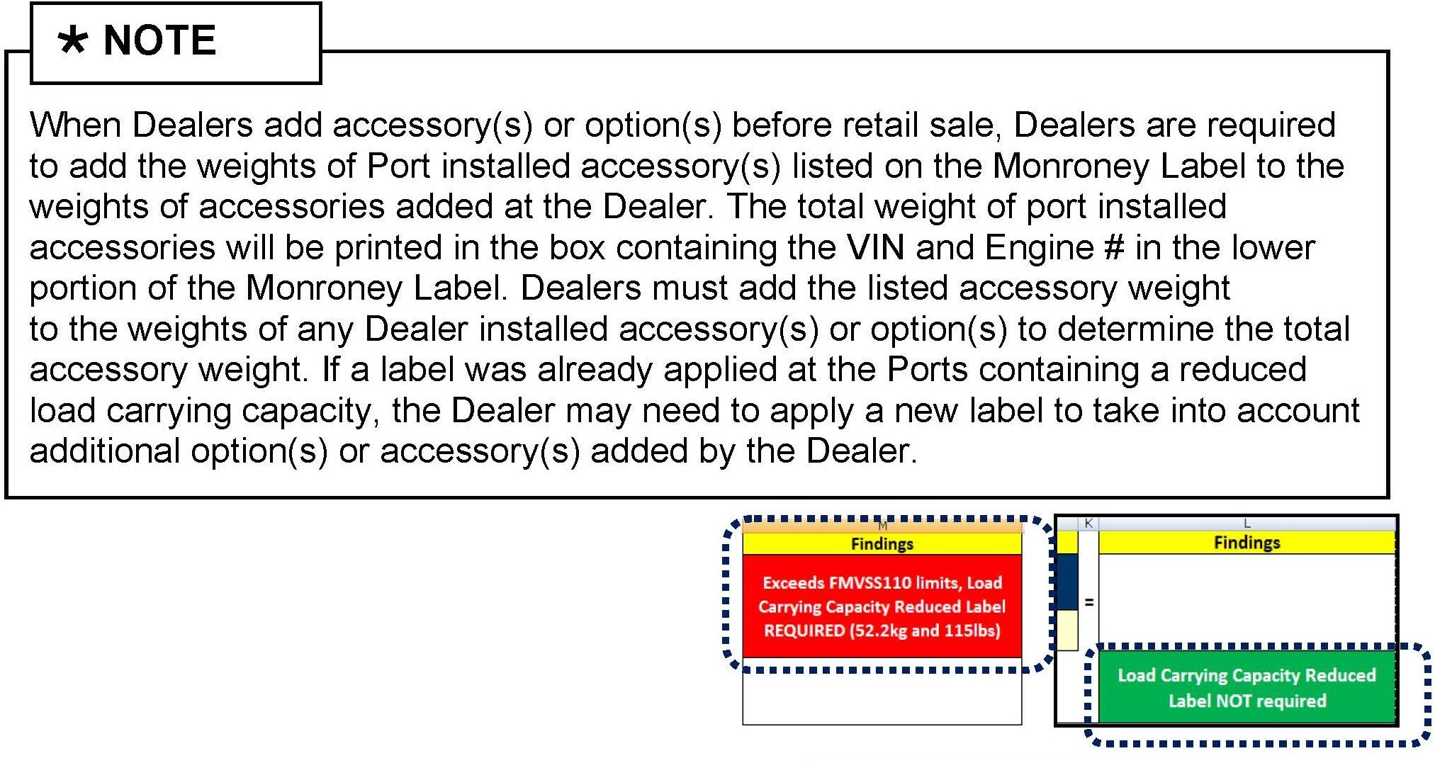 All Dealers must determine if the weight they have added in the form of a single or multiple option(s) or accessory(s), when added to the weight of any Port installed option(s) or accessory(s), exceeds the lesser of 1.5% of GVWR or 45.4kg (100 lbs). All Port installed or Dealer installed options must be included in the weight analysis. If the additional weight does exceed the lesser of the indicated thresholds, a "Load Carrying Capacity Reduced" Label must be installed. A black, fine point, indelible marker must be used to write by hand onto the label the reduced carrying capacity in kilograms and pounds, which is the total weight of all the added option(s) or accessory(s).