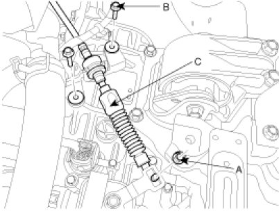 3. Remove the shift cable (C) after removing the nut (A) and the bolt (B).