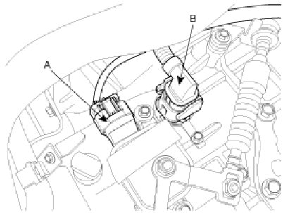 4. Disconnect the solenoid valve connector (B) and inhibitor switch connector (A).