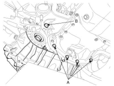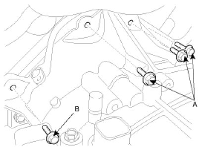 7. Remove the automatic transaxle upper mounting bolt (A,B).
