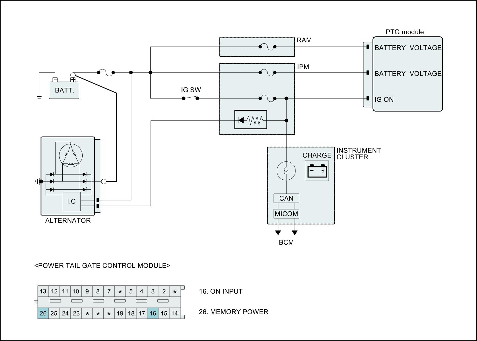 Power Tail Gate (hereinafter PTG) is the system which moves tail gate of vehicle by electronic motor so that user can open or close door with less force than required on manual operation. PTG consists of drive unit, handle, switch, warning buzzer, anti pinch (right/left) and cinch/latch (2 switch each). Drive unit is located at left D pillar (quarter panel). It is core part of PTG that drives leg which is connected with push rod by force of motor to move tail gate. beside that Drive unit consists of PTG ECU, motor, push rod, channel, clutch and two optical sensor.