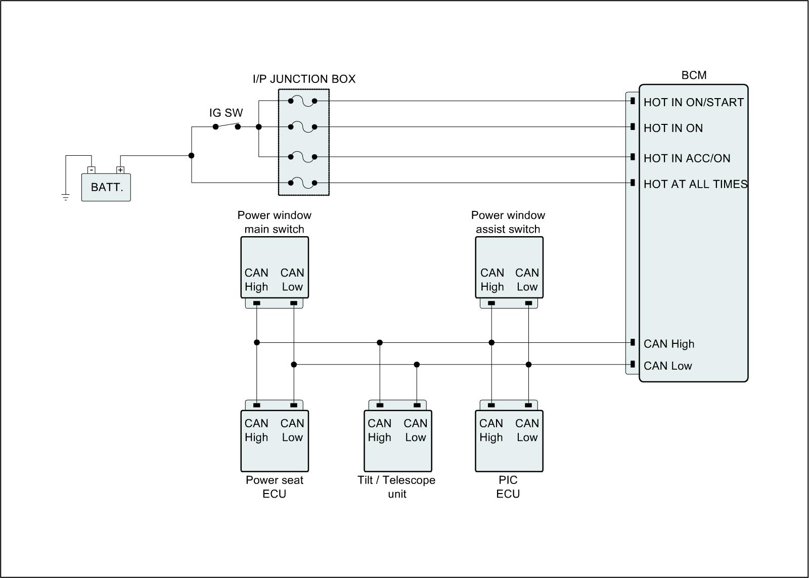 * ECU's : BCM, power window main switch, power window assist switch, power seat ECU, tilt/telescope control unit, PIC (Personal Identification Card) ECU.