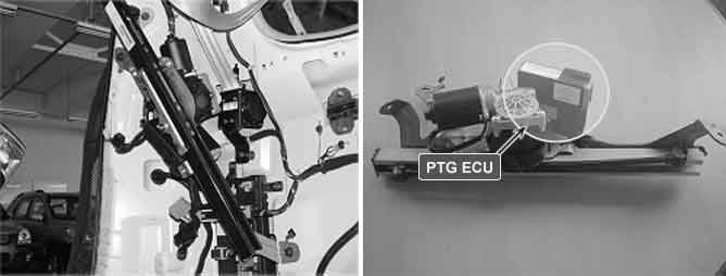 Power Tail Gate (hereinafter PTG) is the system which moves tail gate of vehicle by electronic motor so that user can open or close door with less force than required on manual operation. PTG consists of drive unit, handle, switch, warning buzzer, anti pinch (right/left) and cinch/latch (2 switch each). Drive unit is located at left D pillar (quarter panel). It is core part of PTG that drives leg which is connected with push rod by force of motor to move tail gate. beside that Drive unit consists of PTG ECU, motor, push rod, channel, clutch and two optical sensor.