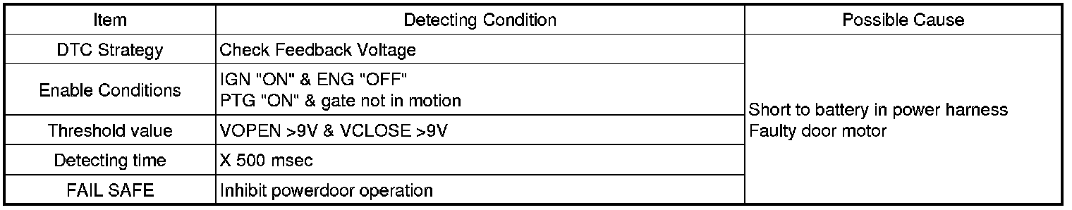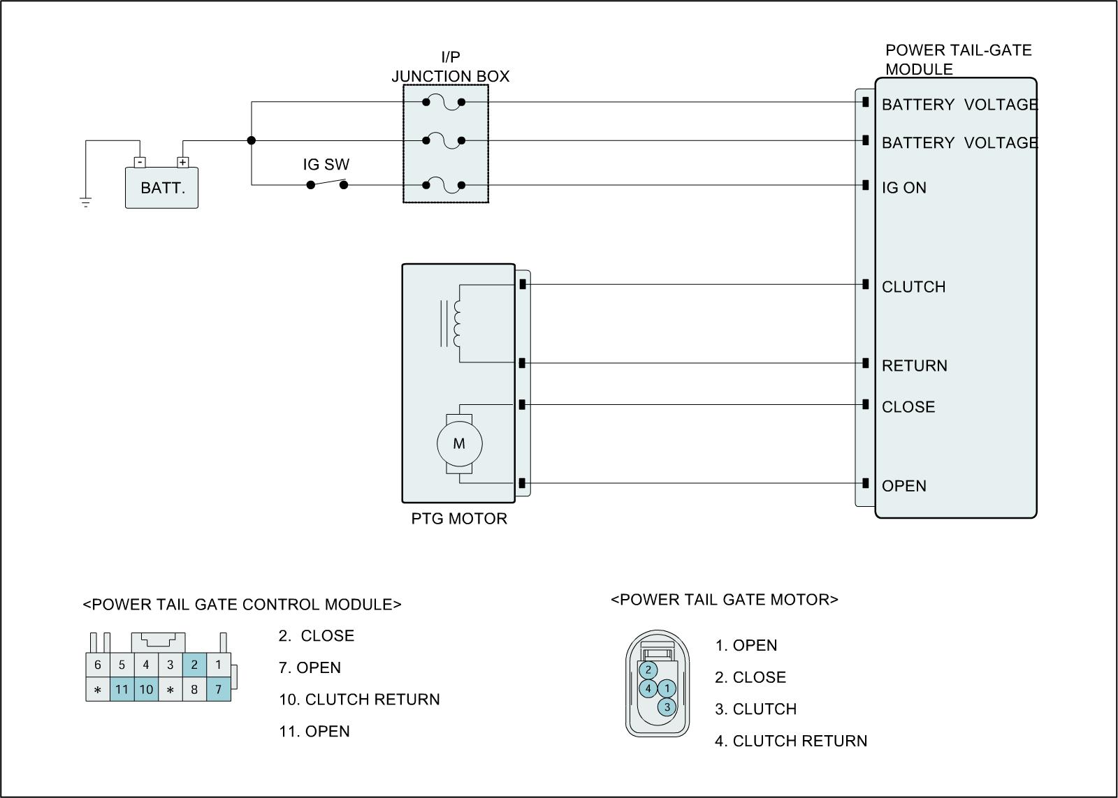 Power Tail Gate (hereinafter PTG) is the system which moves tail gate of vehicle by electronic motor so that user can open or close door with less force than required on manual operation. PTG consists of drive unit, handle, switch, warning buzzer, anti pinch (right/left) and cinch/latch (2 switch each). Drive unit is located at left D pillar (quarter panel). It is core part of PTG that drives leg which is connected with push rod by force of motor to move tail gate. beside that Drive unit consists of PTG ECU, motor, push rod, channel, clutch and two optical sensor When power gate open signal is received, PTG ECU operates motor of drive unit and pinion gear transmits drive force of motor into an up-and-down motion of leg. according to motion of leg, push rod move vertically to move gate. Optical sensor monitors these system operation and delivers it to PTG ECU.