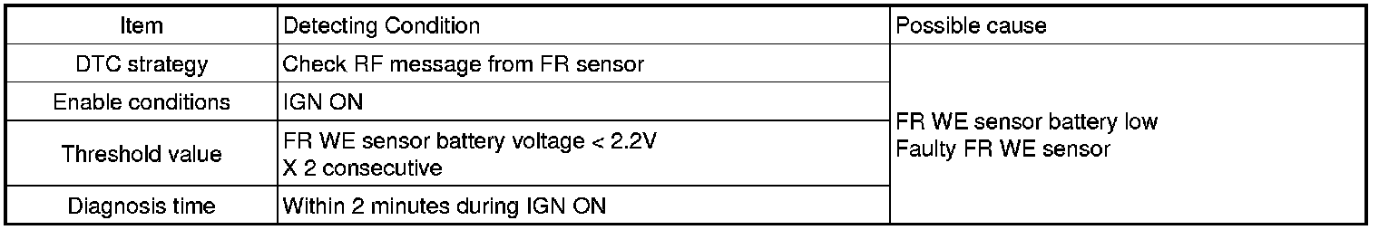This DTC indicates that the Front Right WE sensor battery voltage is below 2.2 Vdc. The most likely cause is battery passing it's expected life / sensor failure.