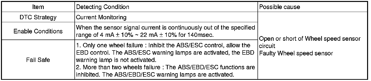 If the sensor signal current is continuously out of the specified range for 140 msec, then the HECU determines that the circuit is open/short, and sets this code.