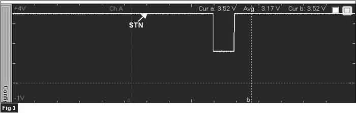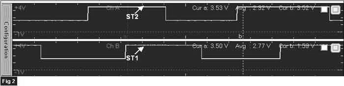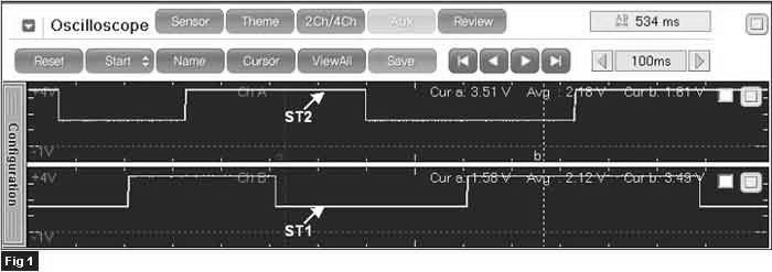 Fig 2) Normal waveform of steering angle sensor with turning right after ENG "ON" : Output signal change ("LOW" -> "HIGH") is detected first in ST2.