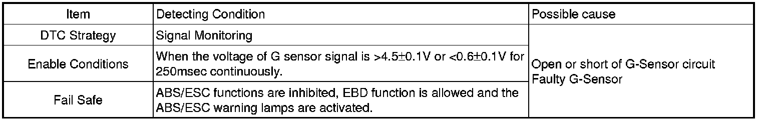 The HECU monitors the G-sensor voltage continuously, and sets this code if the voltage is either higher than the permissible normal value (approx. 4.5 V) or lower than the value (approx. 0.6 V) for more than 250 ms.